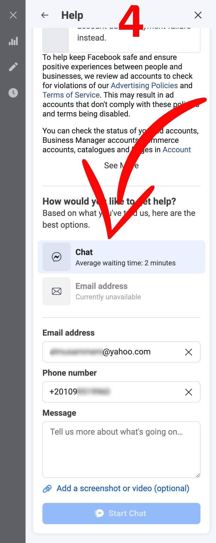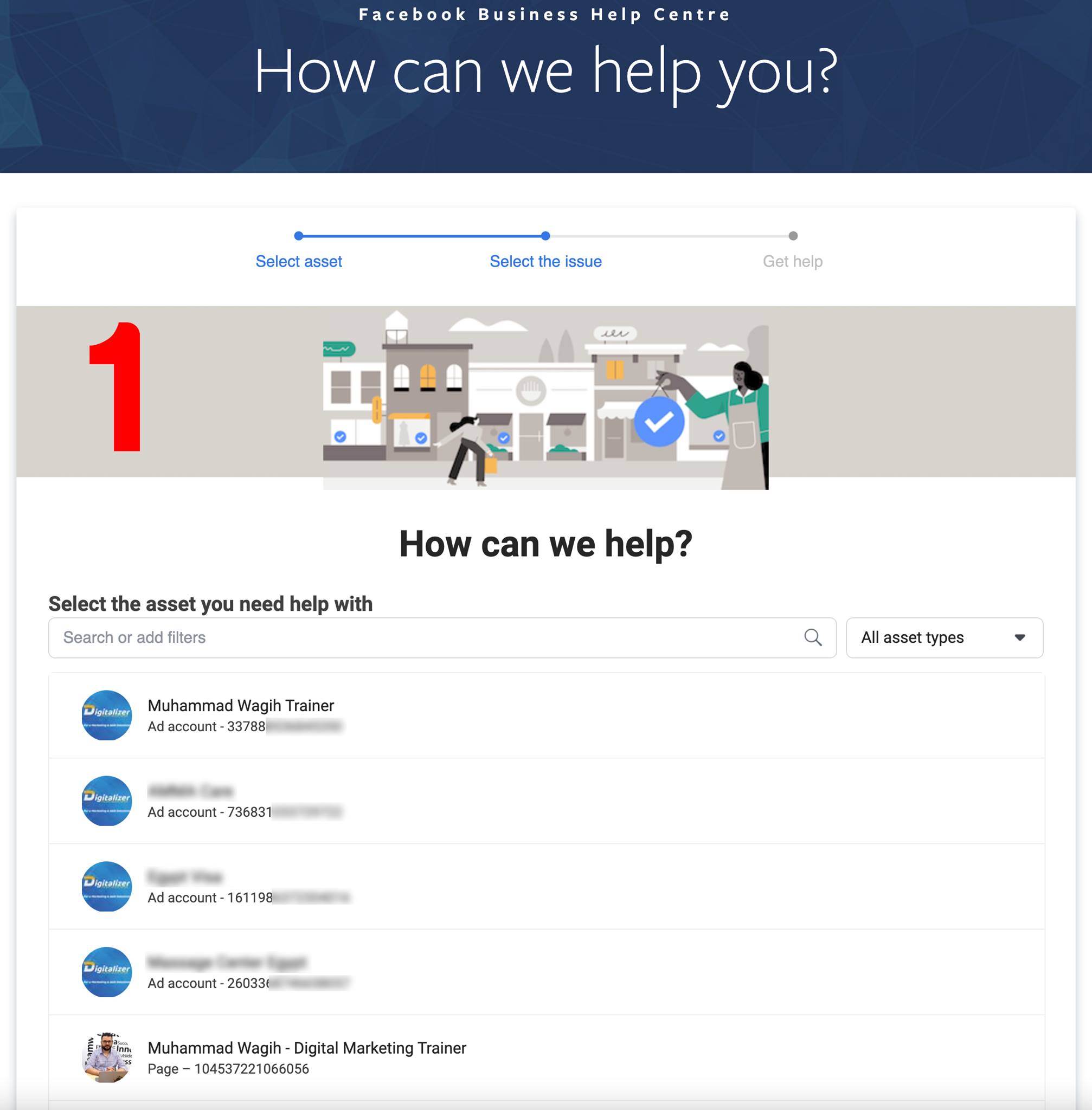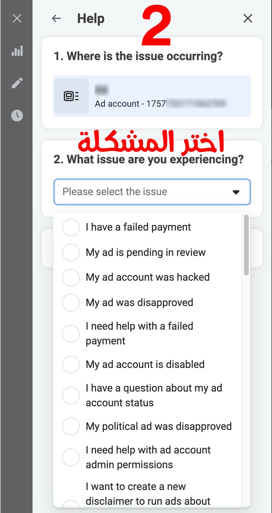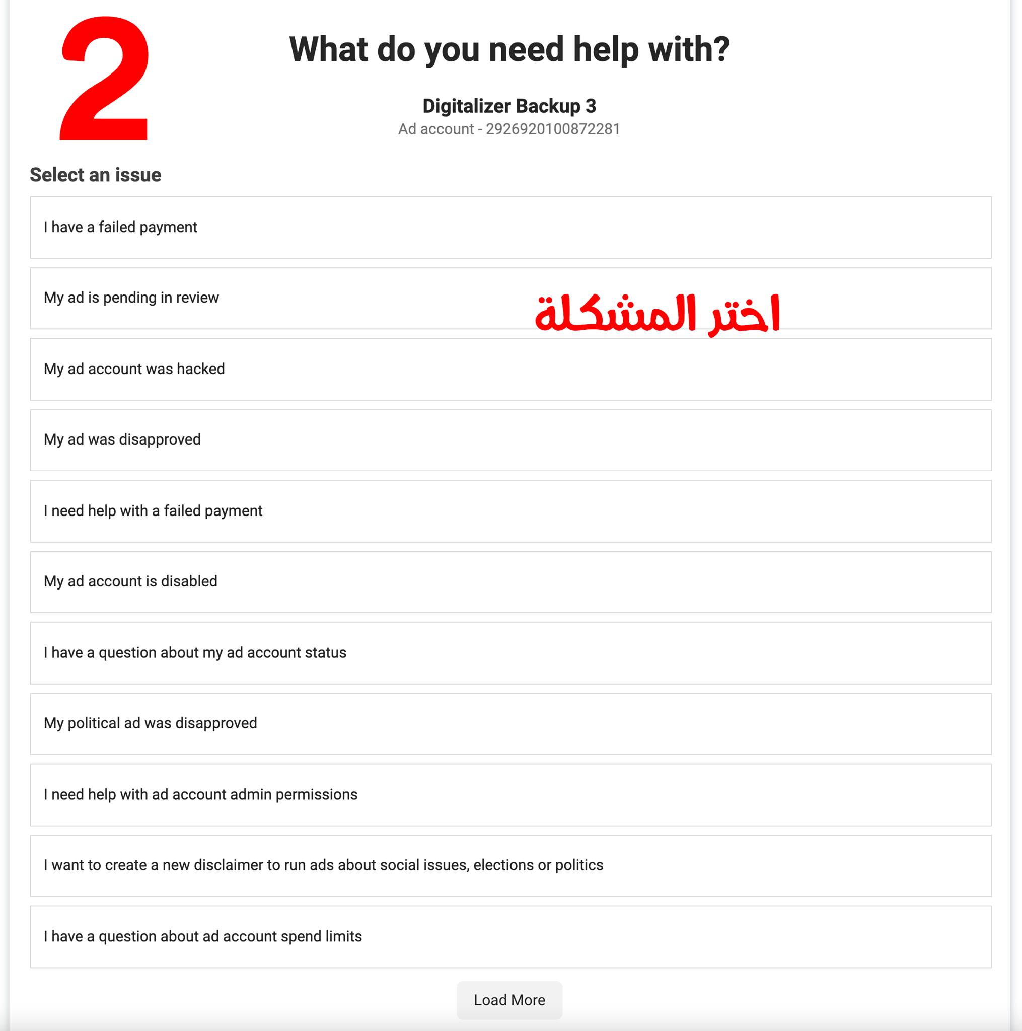 اختار الحساب أو البيزنس أو الصفحة اللي محتاج تراسل الدعم بخصوصها وبعدين اختار المشكلة اللي عايز تبلغ عنها زي حساب إعلاني اتوقف أو دفعات مرفوضة أو حساب مخترق أو إعلان بقاله كتير بيتراجع أو إعلان اترفض … إلخ