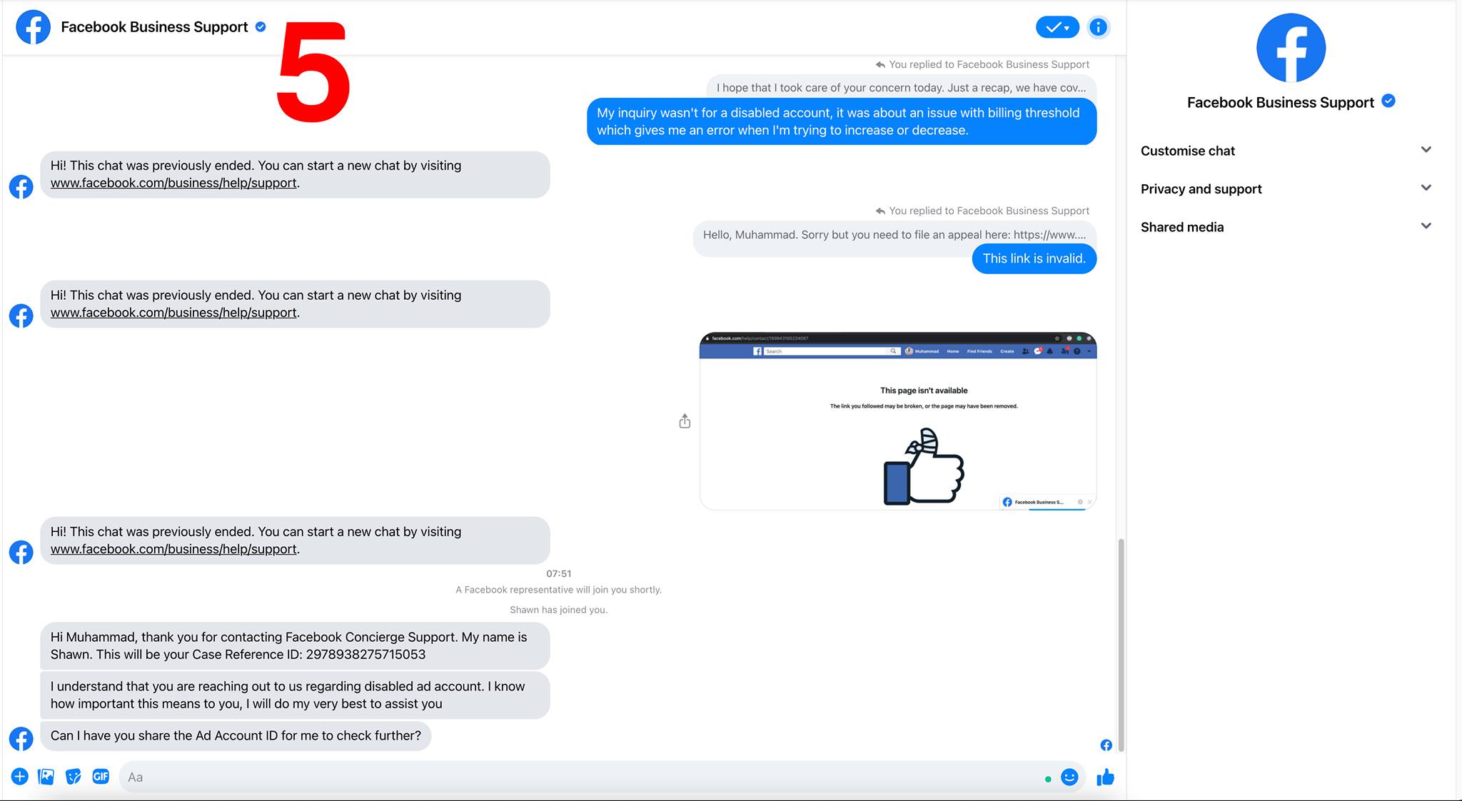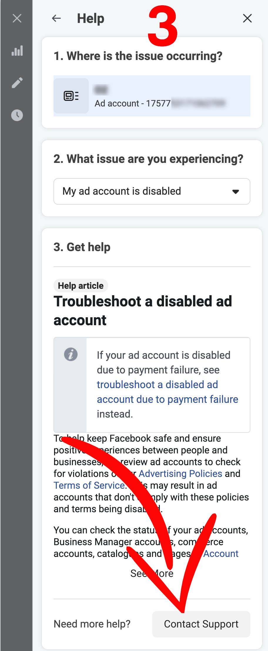 افتح البيزنس أكونت بتاعك من جهاز كمبيوتر واضغط على علامة الاستفهام تحت على الشمال وبعدين على اليمين اضغط على contact support team وبعدين اختار المشكلة اللي بتواجهك وبعدين اضغط على contact support واختار chat أو email واملى بياناتك واكتب المشكلة واضغط على start chat (موضح بالصور).